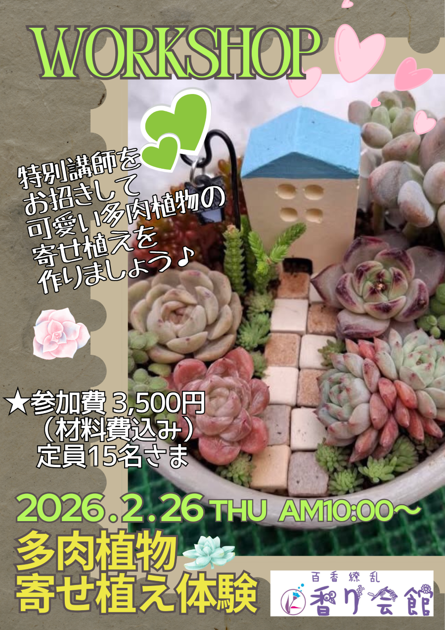 毎月第4木曜日は大人の女子会「フレンドシップ会」ですが、2月は特別企画として特別講師をお招きしたワークショップ「多肉植物寄せ植え体験」を開催いたします♪