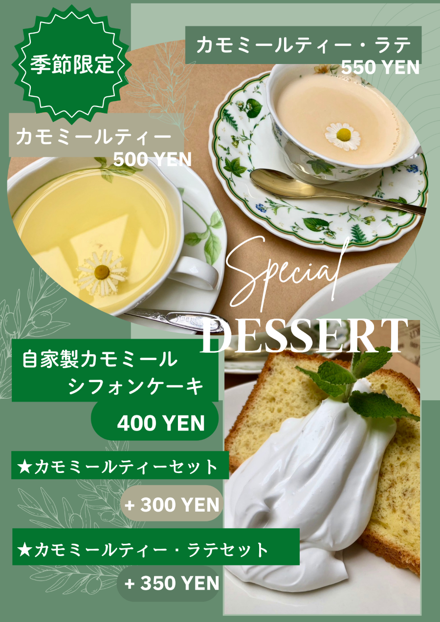 季節限定販売で自家製カモミールシフォンケーキ&カモミールティーまたはカモミールティー・ラテを販売いたします。カモミールのほんのり甘い香りに癒されながらご堪能ください♪