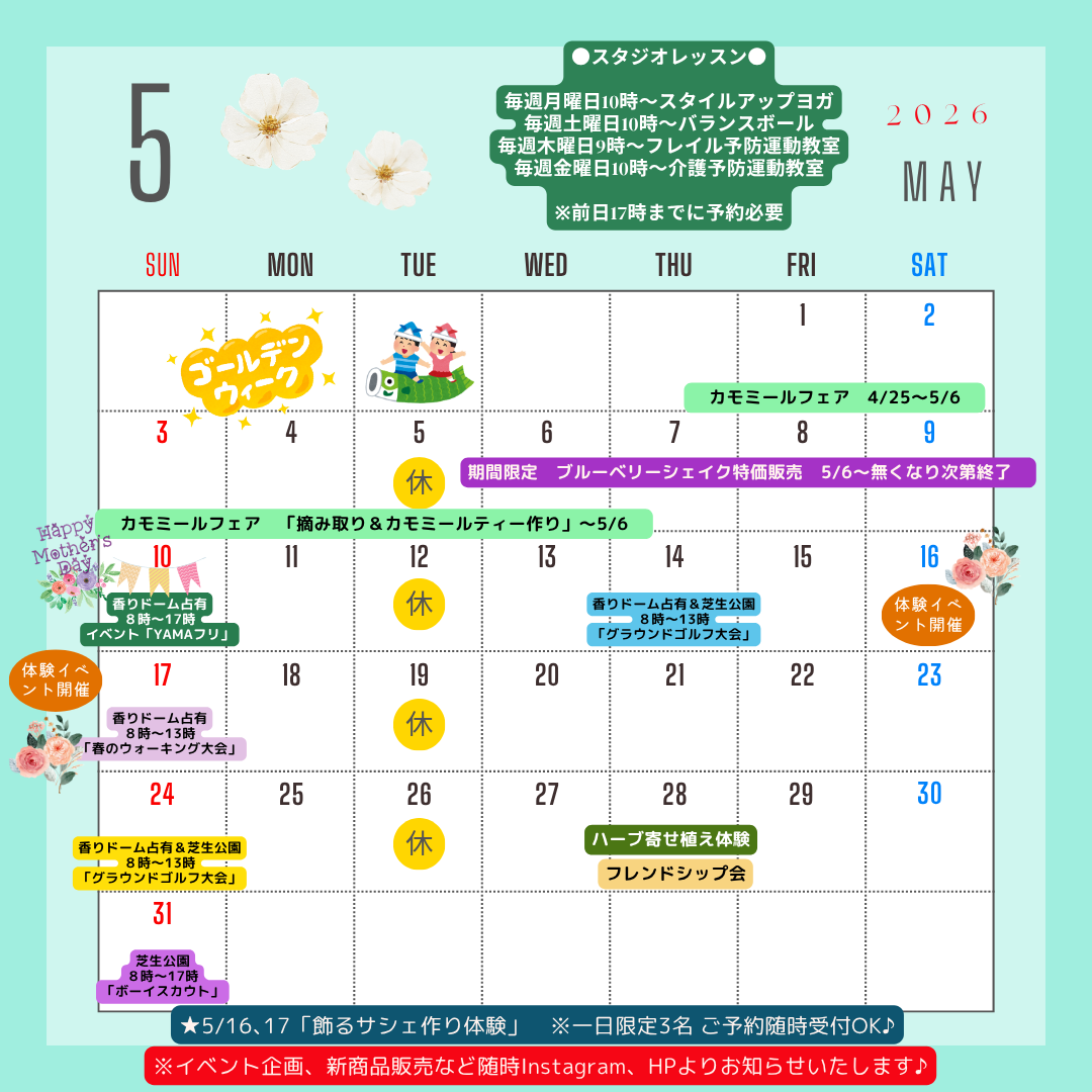 | 体験ゾーン | 香り会館 | 午前9時~午後5時 | 火曜日、12月29日~翌年1月3日 |