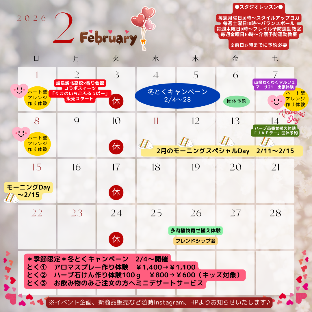 バレンタイン企画として「バレンタインスイーツ」「ハート型フラワーアレンジ体験」をご用意しておりますので、ぜひ2月もご来館くださいね(^^)/