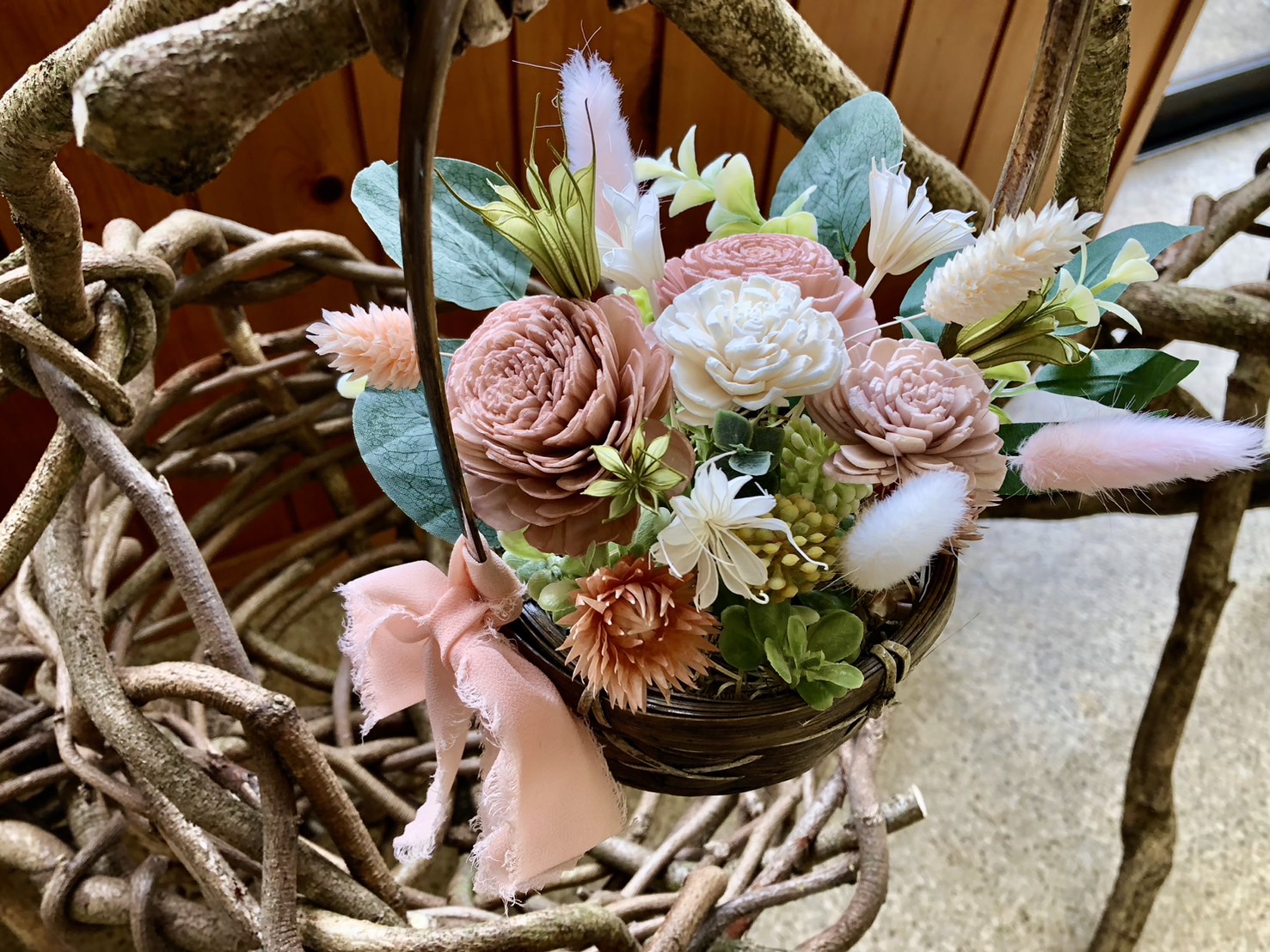 春カラーの花材を選んで制作していただきました。つるかごにひっかけて撮影しましたよ♪