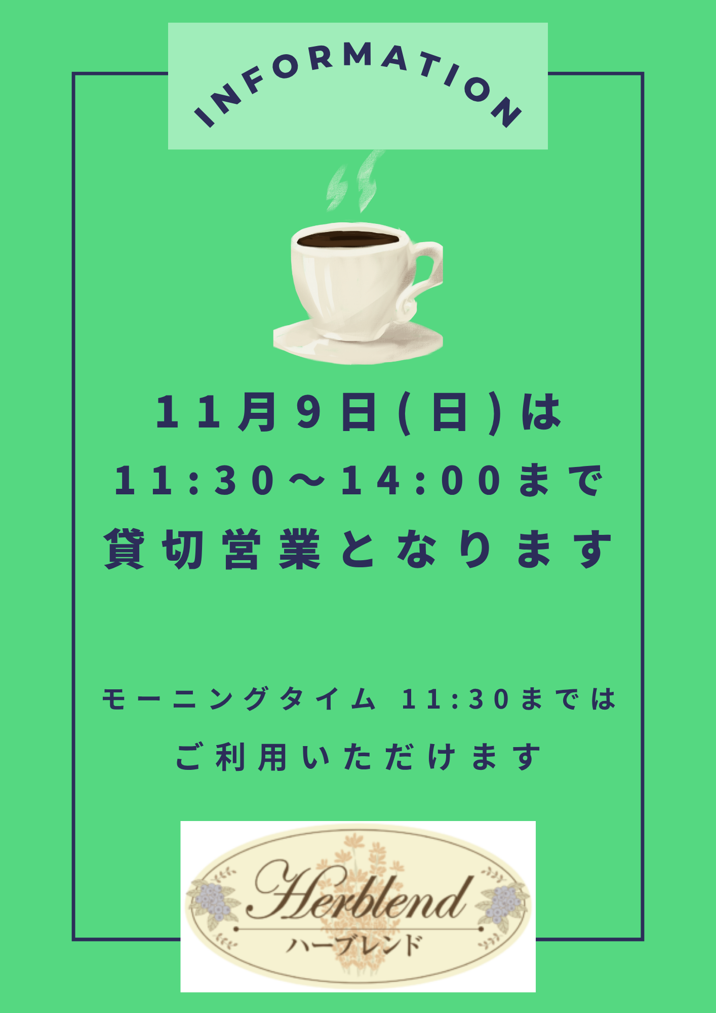 11/9(日)は、団体予約のお客様が見えるため、ティーハウス「ハーブレンド」は以下の時間帯が貸切営業となりますのでご了承のほど、お願い申し上げます。