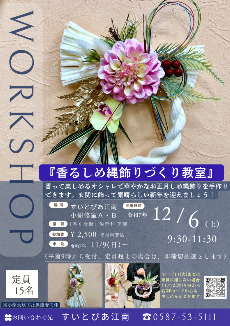 先週11/29「クリスマスリースづくり体験」でもお世話になりましたが、当施設で毎年大好評の「香るしめ縄飾りづくり」体験教室を特別価格にて開催させていただきます。