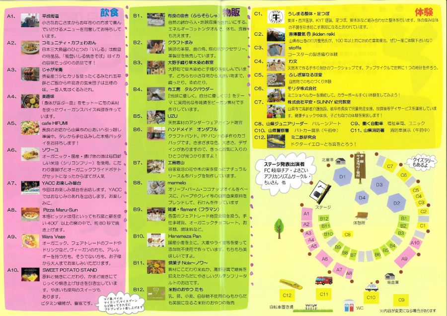 飲食の出店ブース、雑貨類やパン、お菓子などの物販出店ブース、 ワークショップや消防車やパトカーなど働く車の展示ブース、FC岐阜チアダンス、よさこいなど盛り沢山で、わくわくドキドキする山県市の魅力をまるごとお届けいたします♪