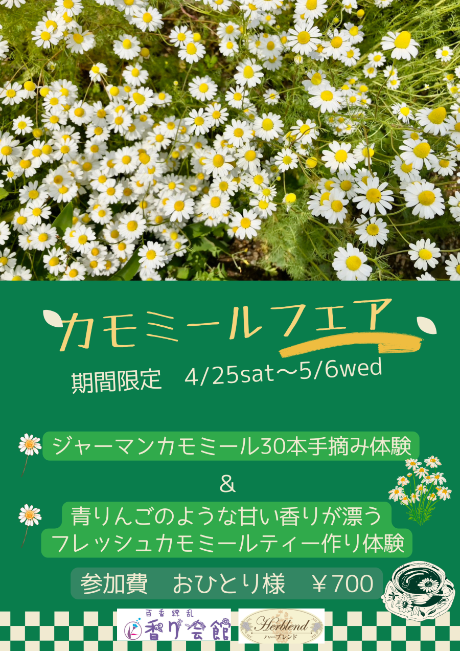 ハーブ園ではカモミール30本手摘み&フレッシュカモミールティー作り体験が毎年大人気で魅力のひとつ!! 期間限定となりますのでお早めにご参加ください(随時受付中)