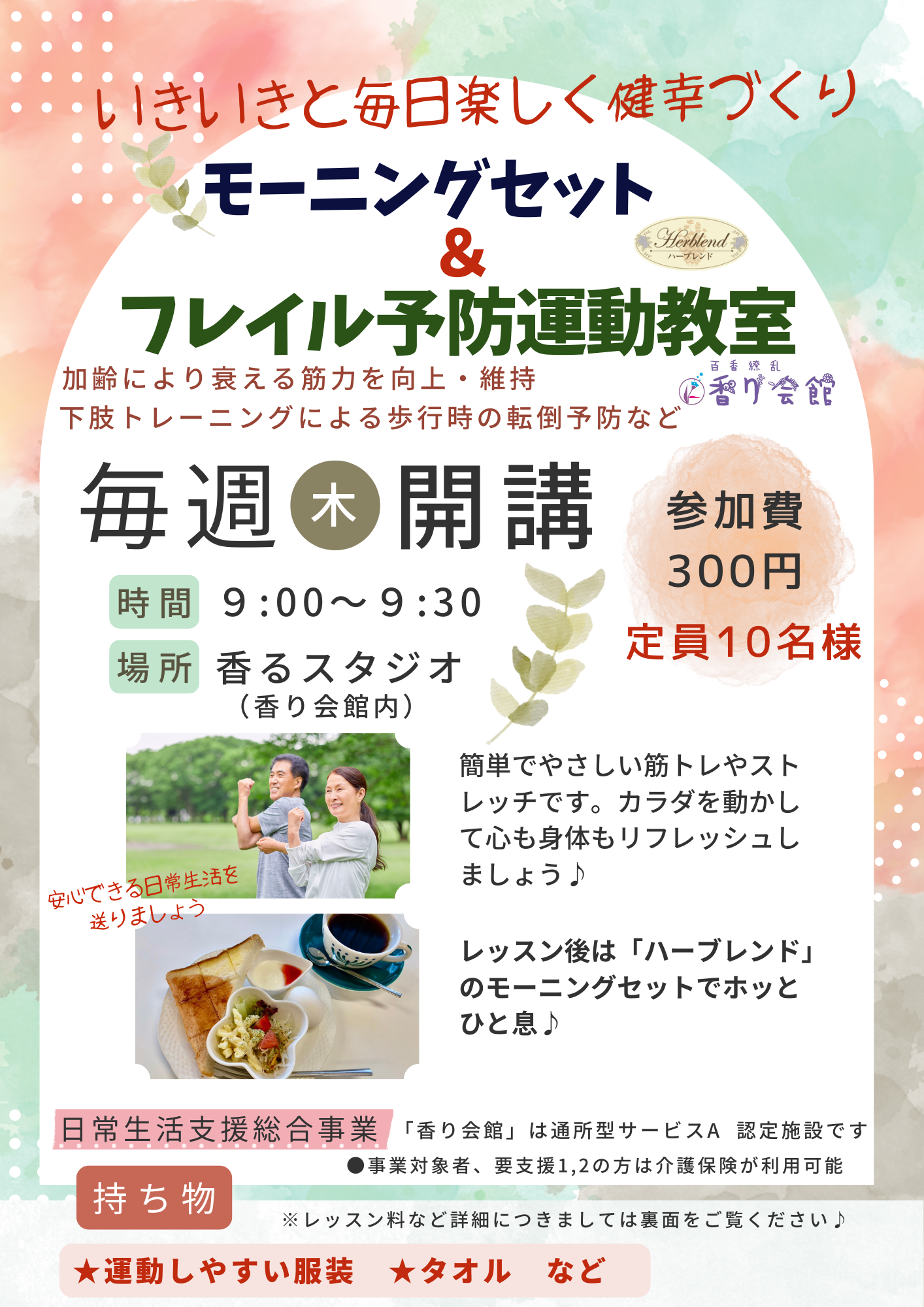 スタジオレッスンでは有酸素運動やリンパの流れを良くする運動など要支援の方向けに軽度の運動を行っています。また香りを楽しみながら足湯で代謝を高めたり、手先の運動としてドライフラワーの資材作りやポプリの袋詰めなども行っていただきます。その後はランチでトークを愉しみます♪